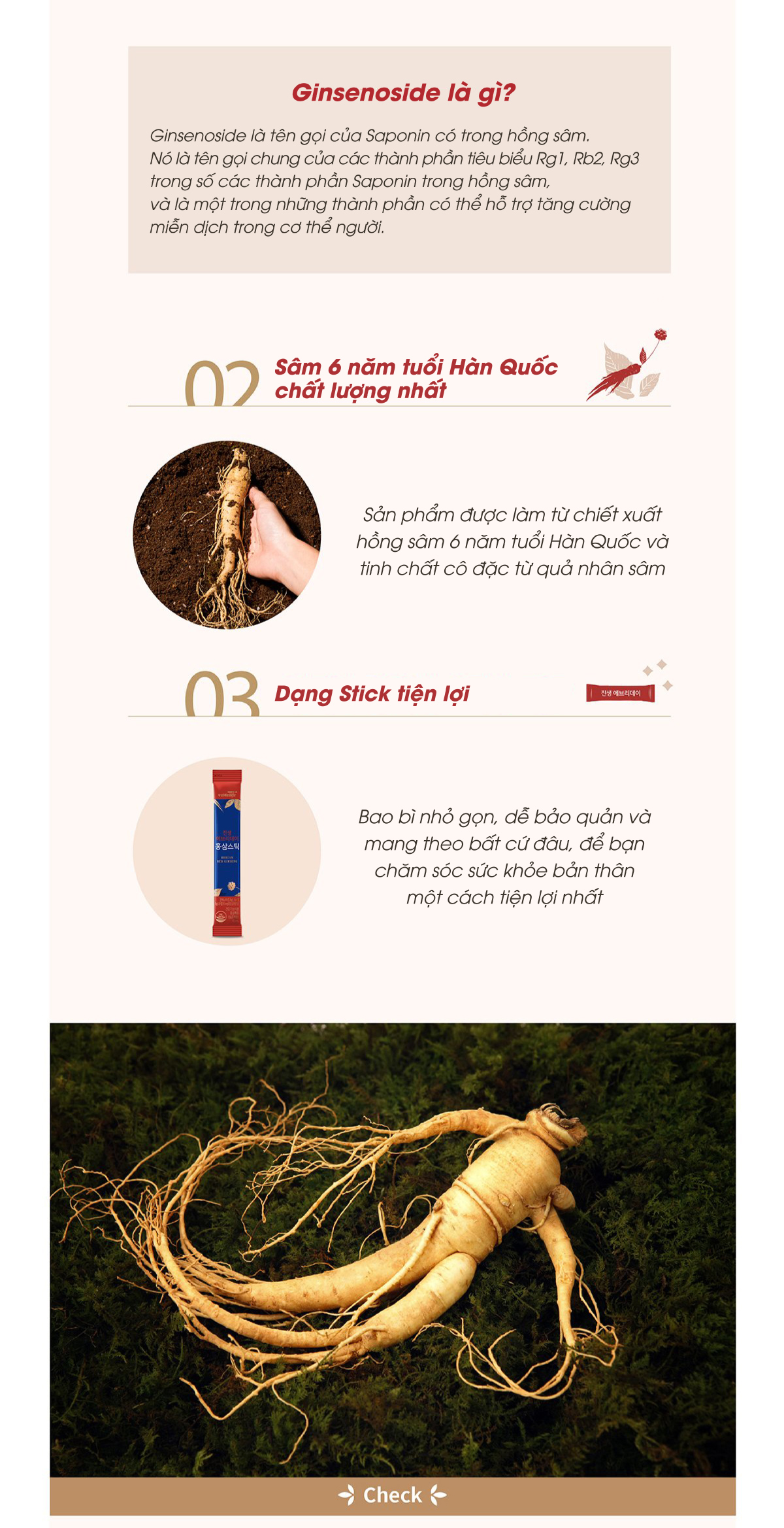Trong 1 gói (10ml) chứa: Nước tinh khiết 8,96ml, hồng sâm cô đặc [hồng sâm 6 năm tuổi (củ hồng sâm 70%, rễ hồng sâm 30%), chất rắn 65%, ginsenoside Rg1, Rb1, Rg3 hàm lượng 25mg/g] 10% (tương đương 1ml) từ nhân sâm tươi 0,6g, chiết xuất quả nhân sâm cô đặc [quả nhân sâm, chất rắn 55%] 0,04ml.